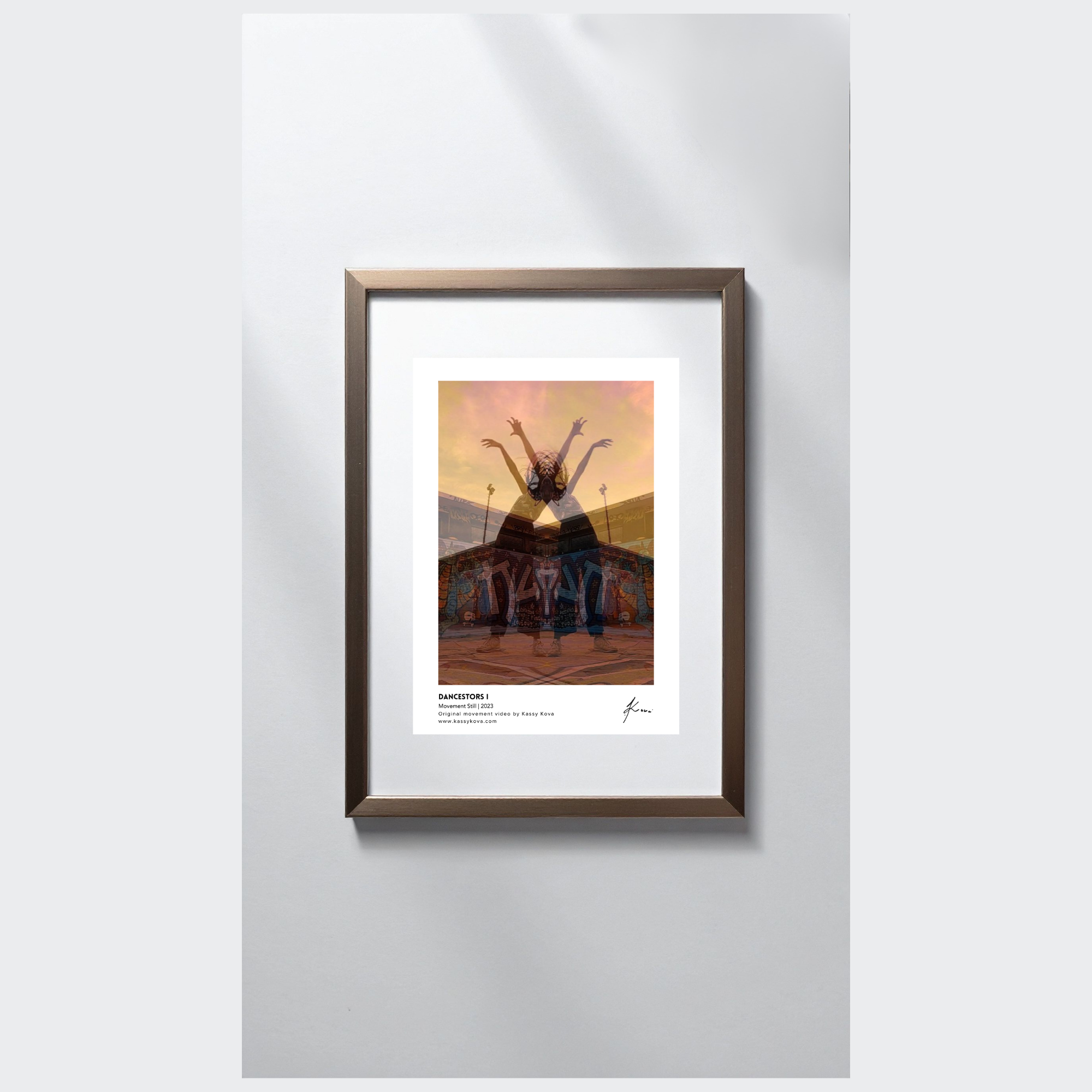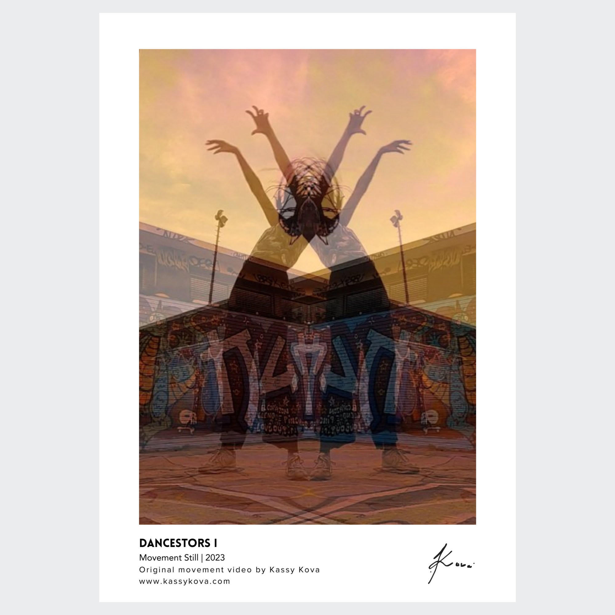 This work is a movement still as part of my movement project, Dancestors. In it, ancestors are summoned through mirrored dance moves, as though summoning an alternate realm. The figures that appear in the juxtaposition of symmetrical positions appeared by coincidence, like ancestral energies revealing their existence. Through the cathartic movement of dance, the artist is able to channel mysterious ancestral powers and connect them through body and form.